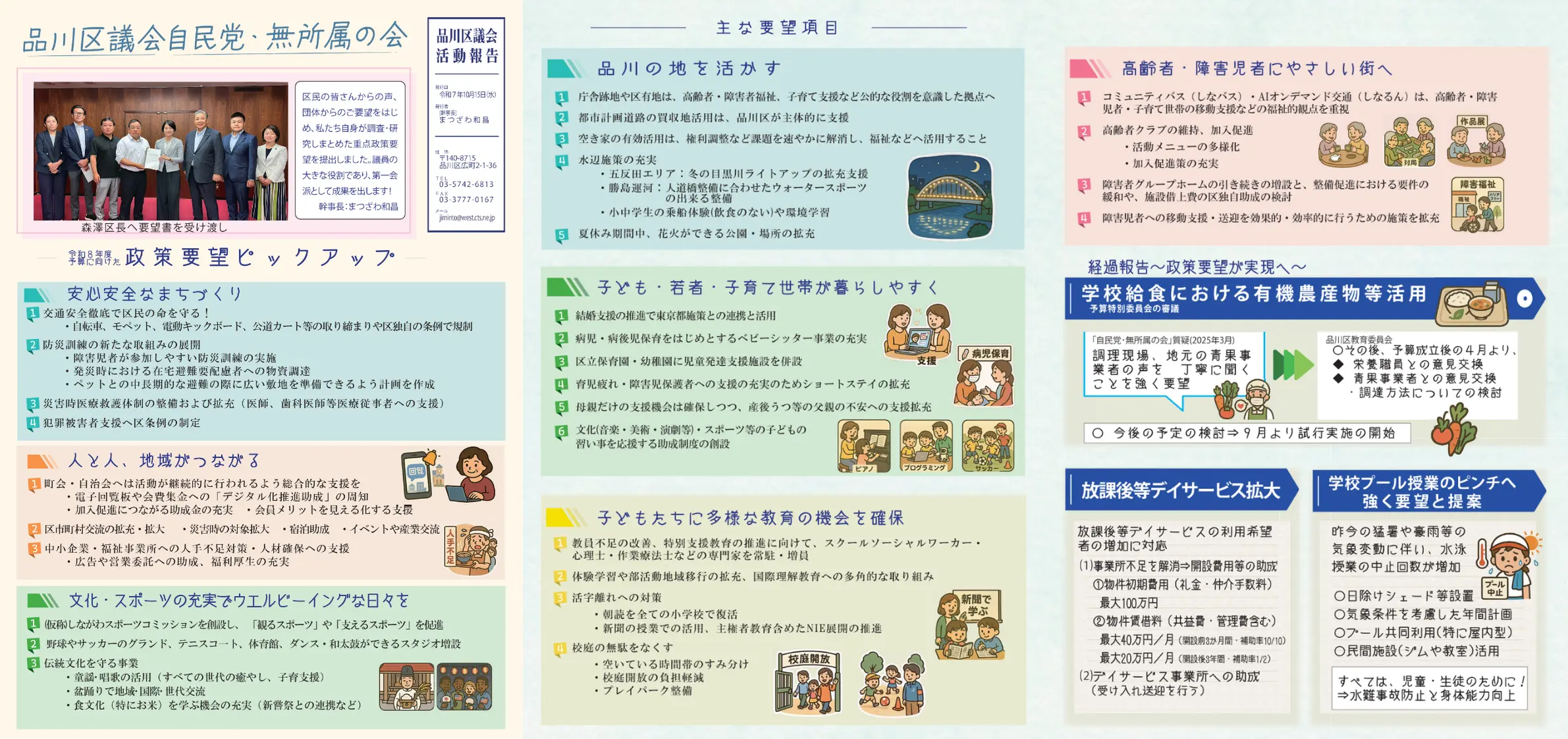 「令和8年度予算に向けた政策要望」を提出しました 2025年10月15日 最終更新日時 : 2025年12月11日 cl_skjm 品川区議会自民党・無所属の会では、上記の通り「令和8年度予算に向けた政策要望」を森澤区長に提出いたしました。 ※画像を押すと拡大してご覧いただけます。 区民の皆さんからの声、団体からのご要望をはじめ、私たち自身が調査・研究しまとめた重点政策要望を提出しました。議員の大きな役割であり、第一会派として成果を出します。(幹事長:まつざわ和昌)※品川区議会自民党・無所属の会『品川区議会活動報告』より抜粋